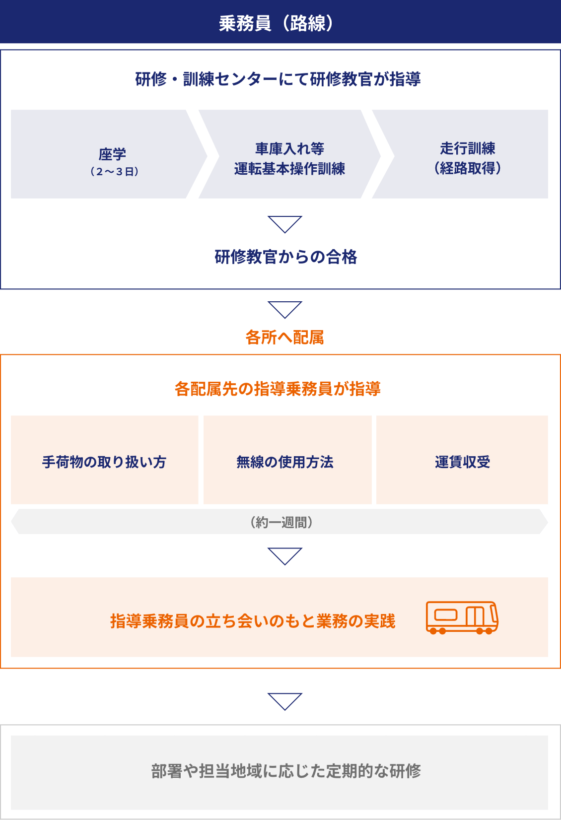 路線運転手は、入社後、研修・訓練センターに配属され、①座学(2-3日)、②車庫入れ等運転基本操作訓練、③走行訓練 の研修を受けます。