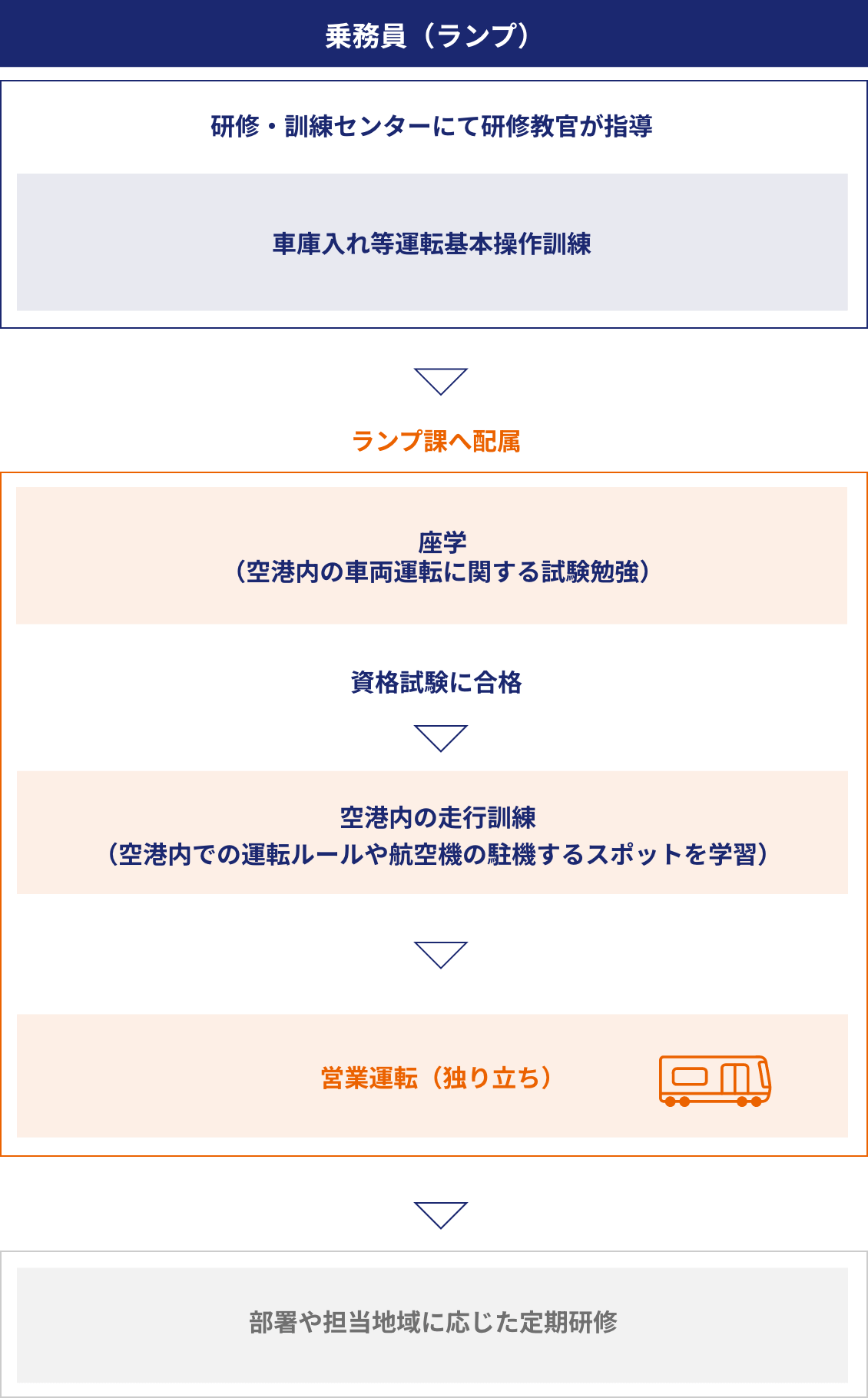 ランプ運転手は、研修・訓練センターでの車庫入れ等運転基本操作訓練が終わると、羽田・成田空港のランプ課へ移り、再び座学で試験勉強を行い、空港内の車両運転に関する資格試験を受験します。この資格試験に合格すると、空港内の走行訓練を始めます。走行訓練では空港内での運転ルールや航空機の駐機するスポットなどを学びます。訓練が完了し営業運転(独り立ち)がスタートするまでに約2ヶ月の期間を見込みます。
